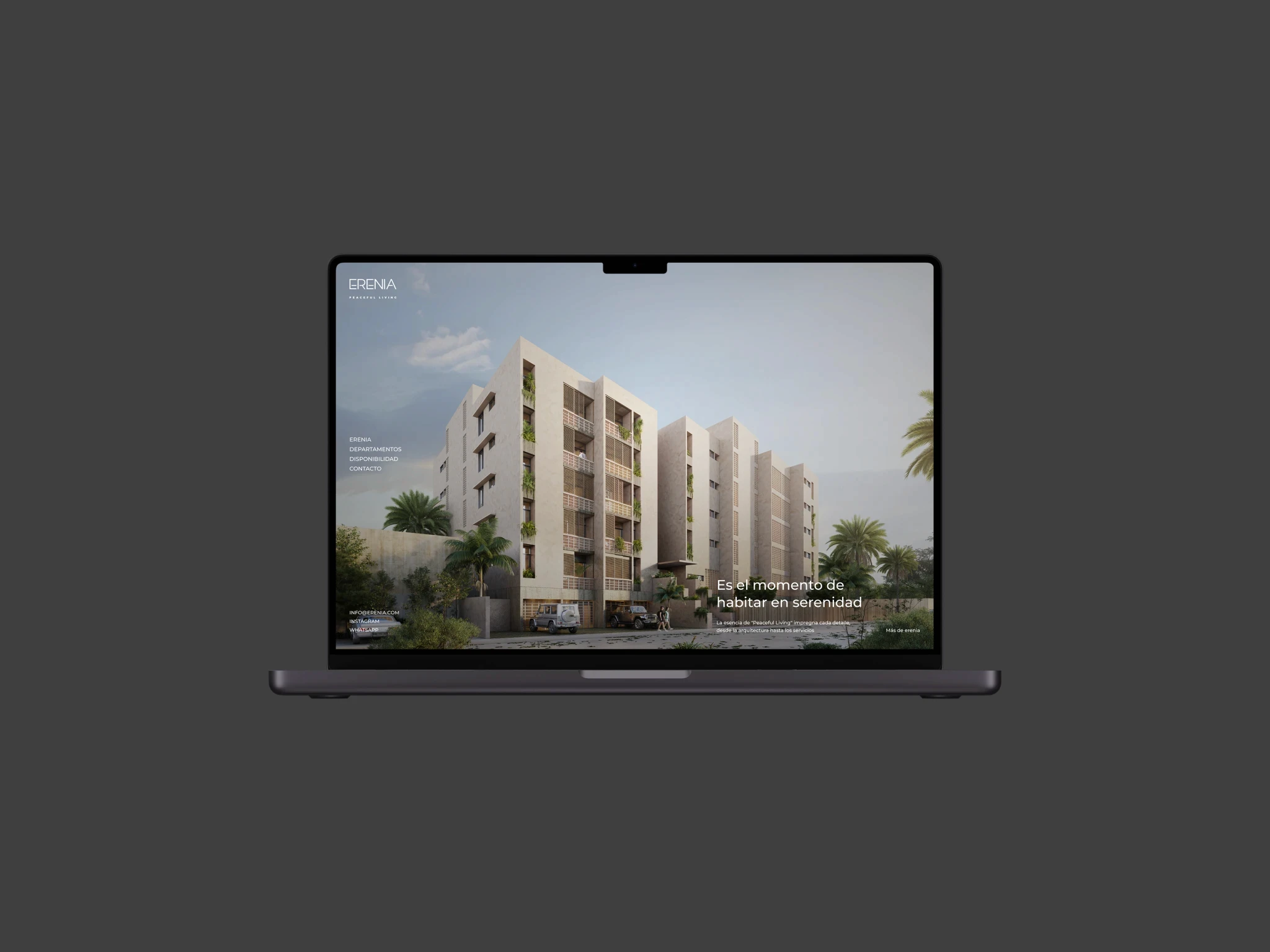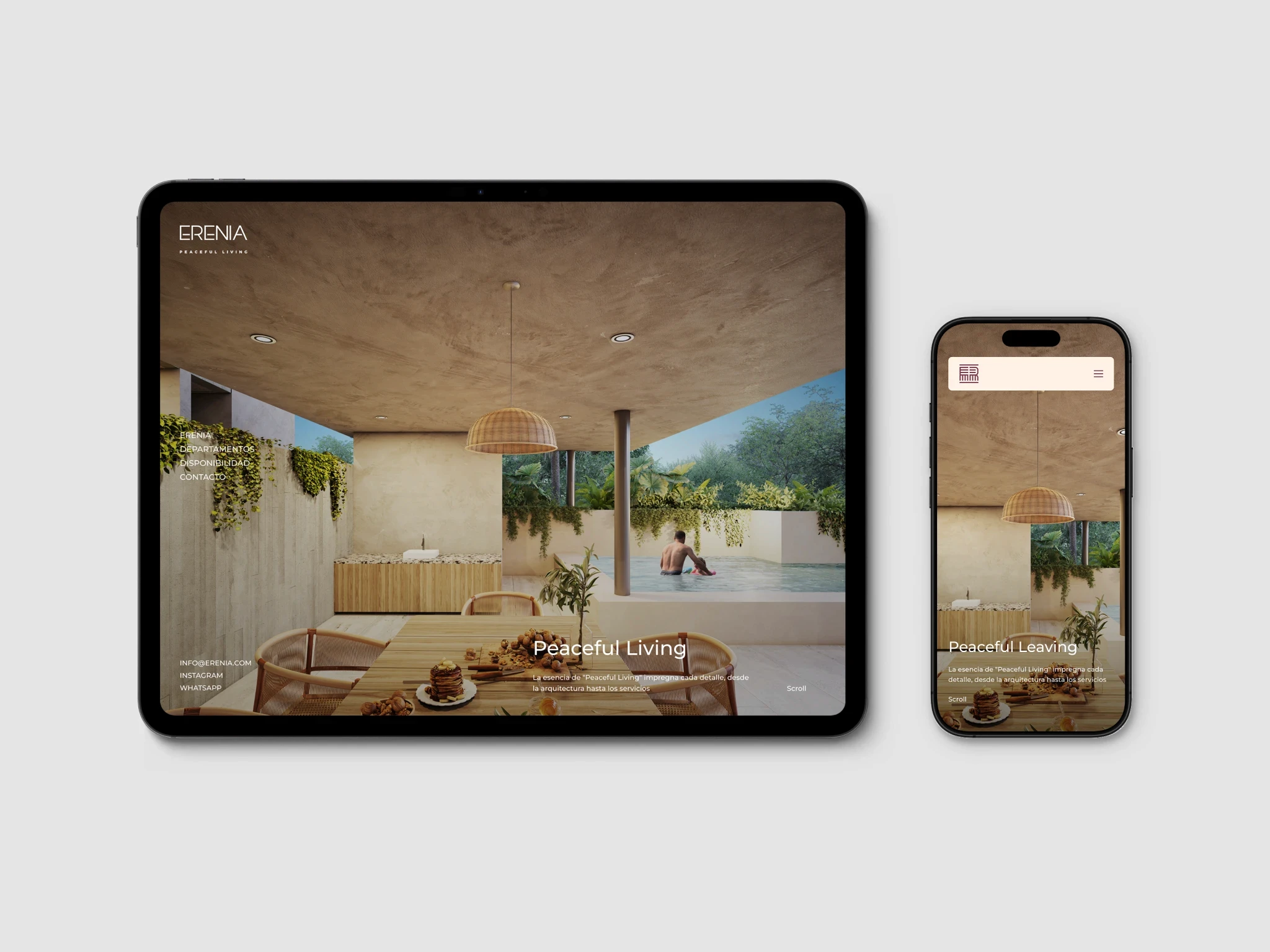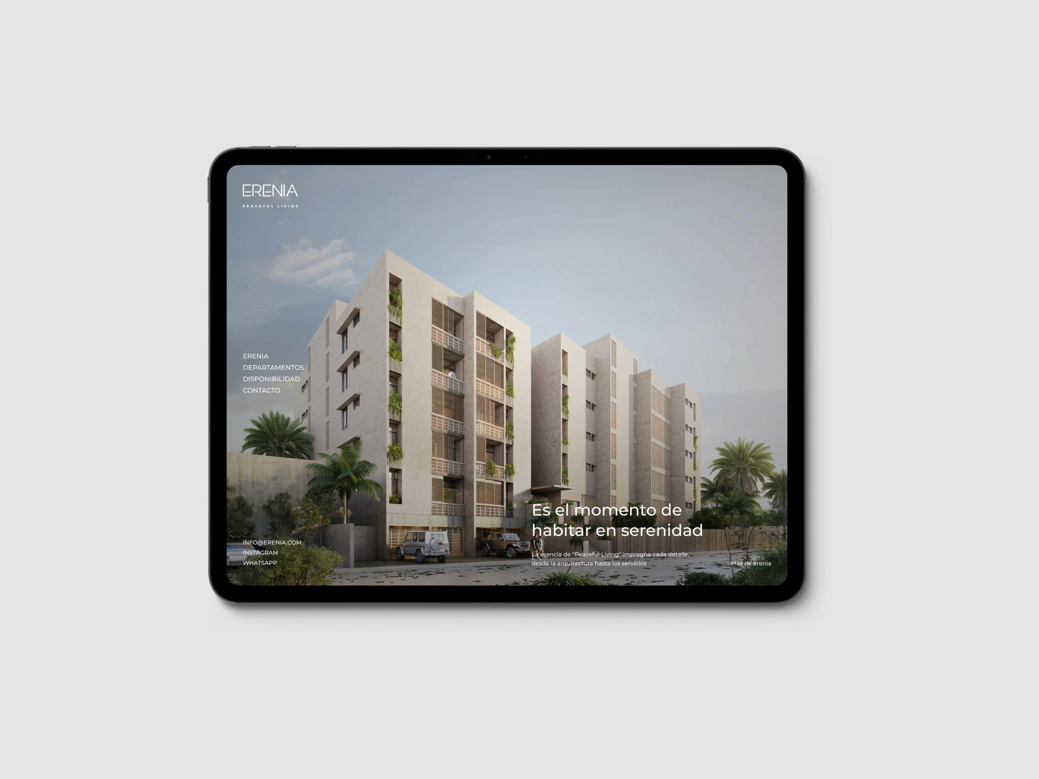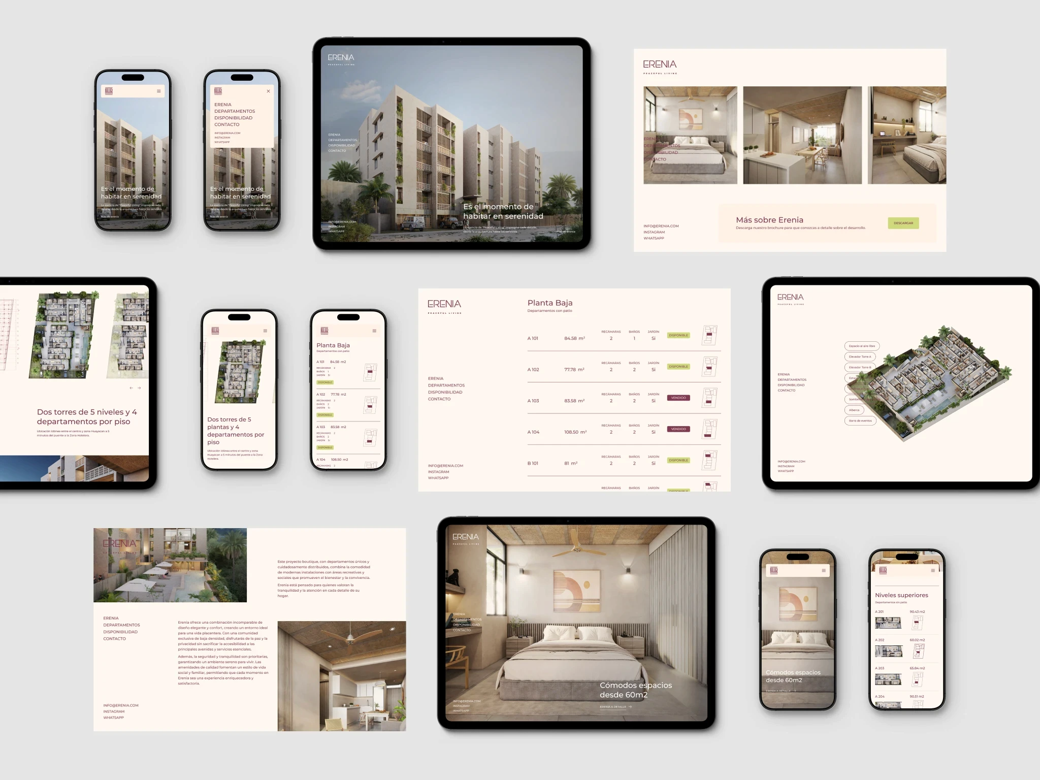 Erenia Peaceful Living es un desarrollo inmobiliario con una narrativa aspiracional, con enfoque claro en estilo de vida. Desde el inicio, el proyecto contaba con un brochure diseñado por Estudio Manila, que definía tanto la estructura del contenido como el lenguaje visual.